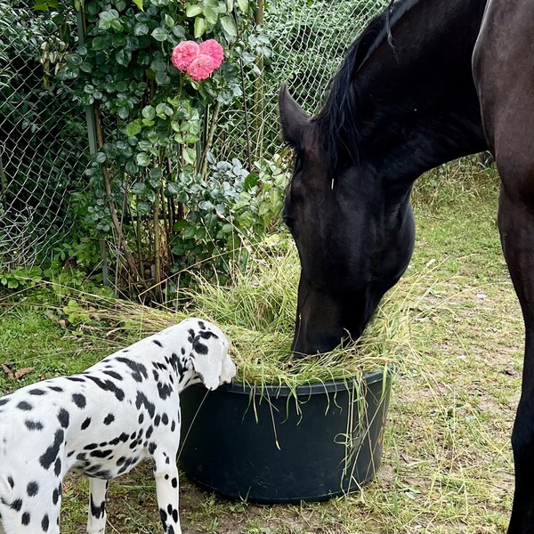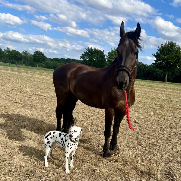 Elsa ist eine ganz liebe, intelligente Hündin, die für jeden Spass zu haben ist. Sie kuschelt gern mit ihren Menschen und liebt ihren Hundekumpel Djotto vom Bahrener Hof und den Friesenwallach Aize.